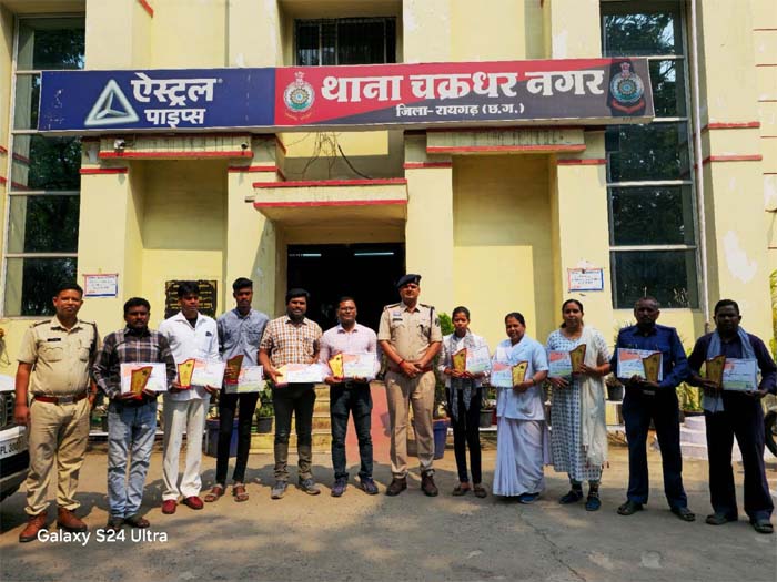 Raigarh News: रायगढ़. चक्रधरनगर थाना परिसर में आज एक विशेष कार्यक्रम आयोजित किया गया, जिसमें मेधावी छात्रों, समर्पित शिक्षकों, नर्सिंग स्टाफ, ग्राम कोटवारों और पुलिस मित्रों को उनके उत्कृष्ट कार्यों के लिए सम्मानित किया गया। पुलिस अधीक्षक श्री दिव्यांग कुमार पटेल के निर्देश पर आयोजित इस कार्यक्रम में थाना प्रभारी निरीक्षक प्रशांत राव ने इन सेवाभावी लोगों को मोमेंटो और प्रशस्ति पत्र देकर उनका उत्साहवर्धन किया।