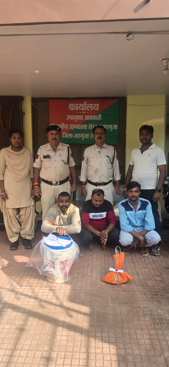 उक्त कार्यवाही सहायक जिला आबकारी अधिकारी रंजीत गुप्ता के द्वारा की गई, साथ में आबकारी उप निरीक्षक तेजराम केहरी तथा हमराह स्टाफ में मुख्य आरक्षक कुमारु राम, रमेश दुबे अशोक सोनी नगर सैनिक गणेश पांडे, ओम प्रकाश गुप्ता एवं महिला सैनिक राजकुमारी सिंह एवं अंजू एक्का की सराहनीय भूमिका रही।